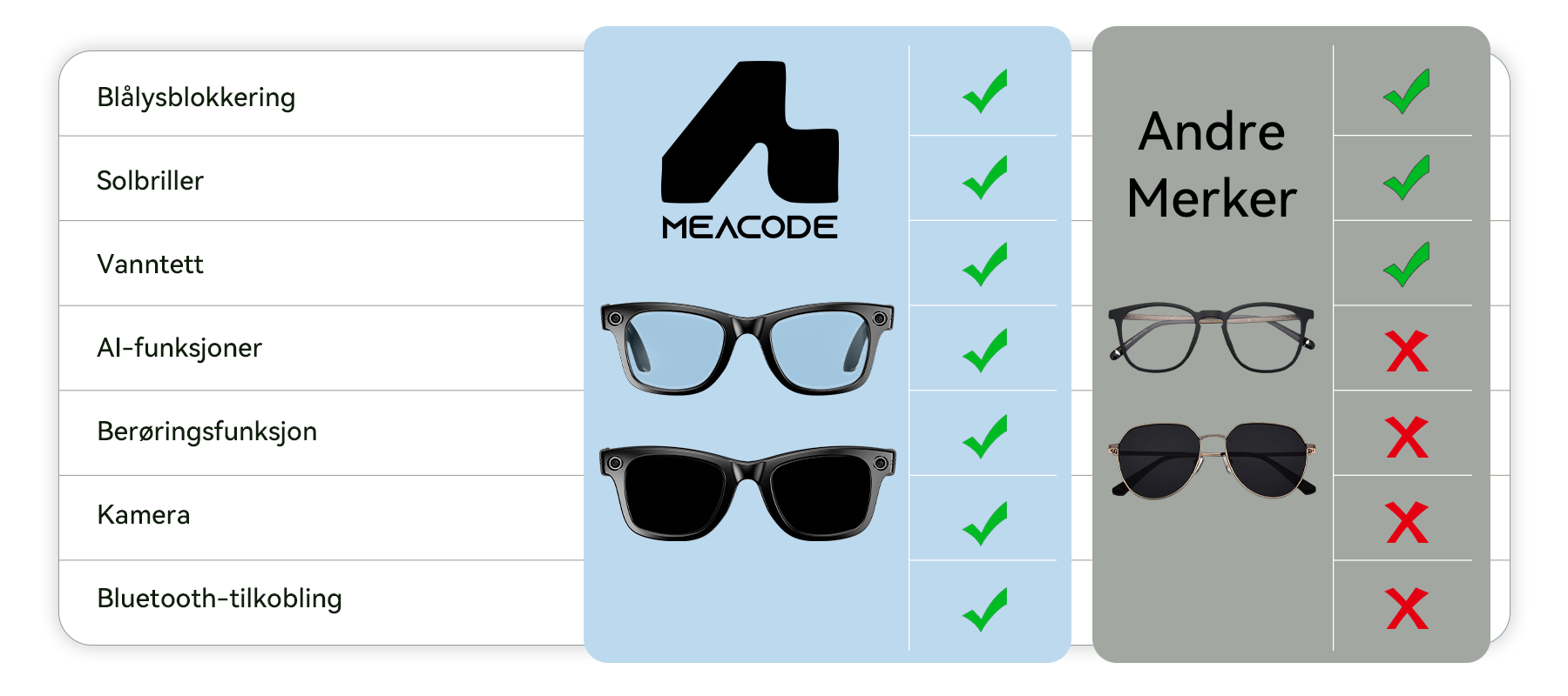 Carters team bygde smarte briller som er lette og kraftige, og som lar deg få tilgang til informasjon mens du fullt ut forblir i øyeblikket. Vi tror at teknologi skal styrke folk. Meacode AI Smart Glasses er en pålitelig partner, som forenkler livet ditt slik at du trygt kan omfavne hver nye begynnelse.