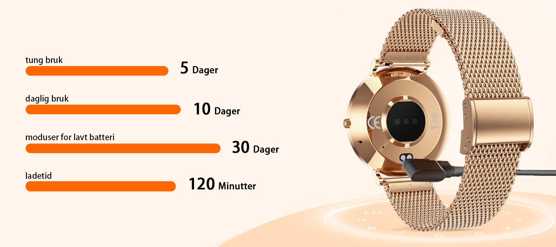 - Forlenget batterilevetid og hurtiglading: Nyt opptil 3-5 dagers bruk på en enkelt lading. Kun 15 minutter med magnetisk hurtiglading gir deg en hel dags strøm.