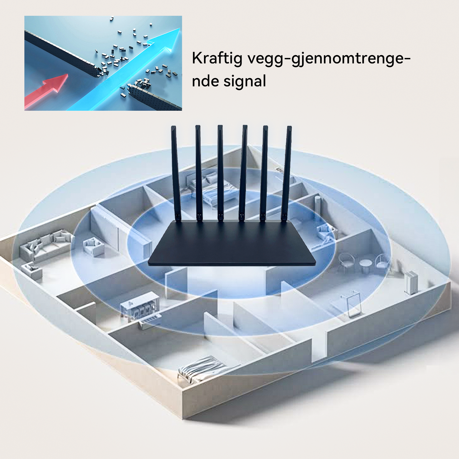 Takket være sine 6 høyytelsesantenner og intelligente OFDMA + MU-MIMO-teknologi, sikrer ruteren at et kraftig signal når hvert hjørne av hjemmet ditt. Enten du ser på film i kjelleren, jobber på soverommet eller hører på musikk i hagen, vil du oppleve et konsekvent raskt og stabilt nettverk.